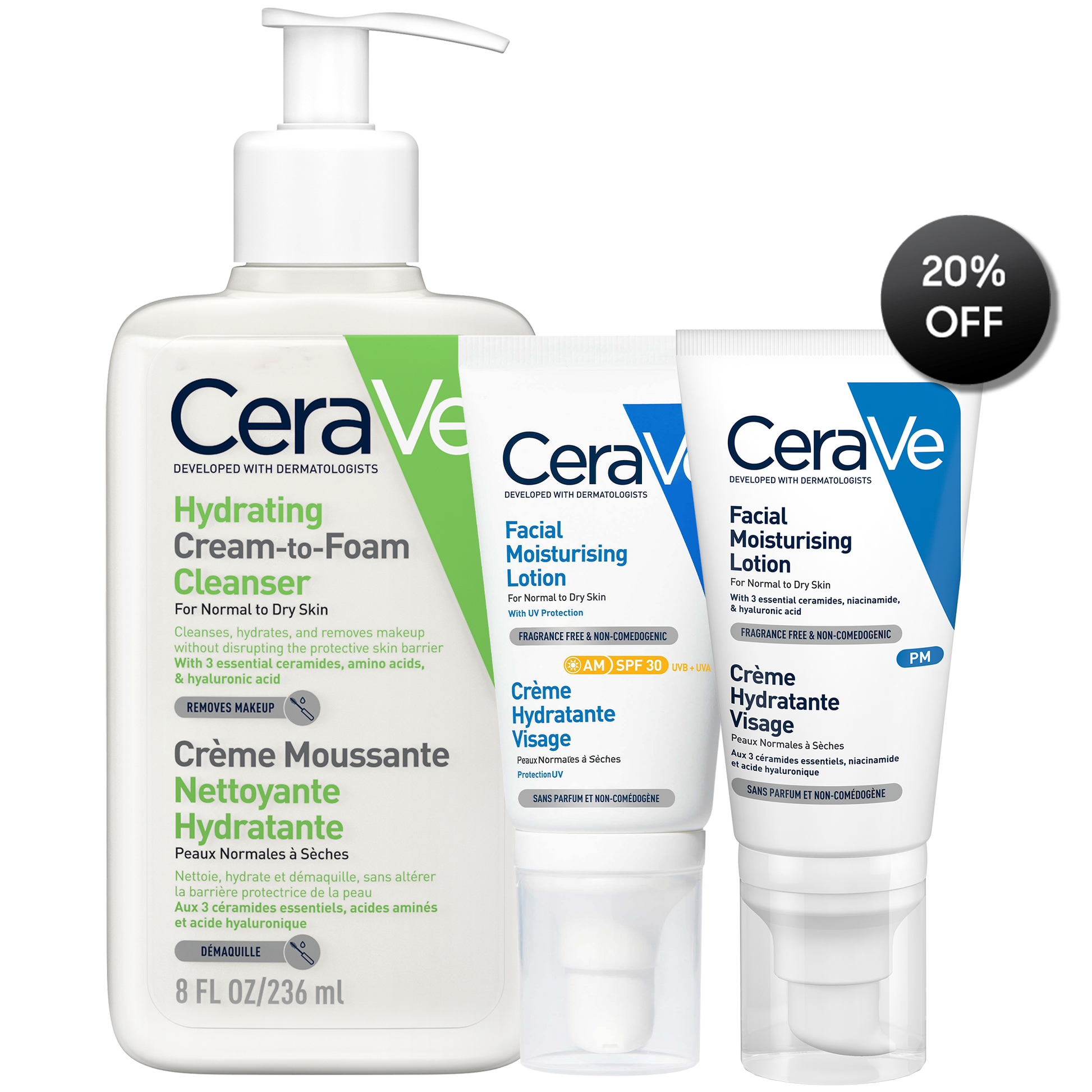 Keep your skin clean, protected, and deeply hydrated from morning to night with this dermatologist-developed CeraVe trio. Powered by essential ceramides and hyaluronic acid, this routine helps maintain a healthy skin barrier while providing long-lasting moisture and daily sun protection.